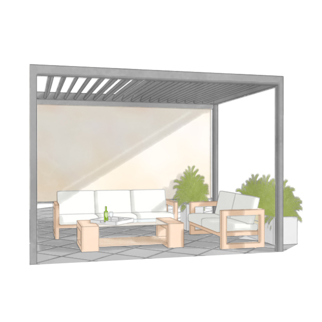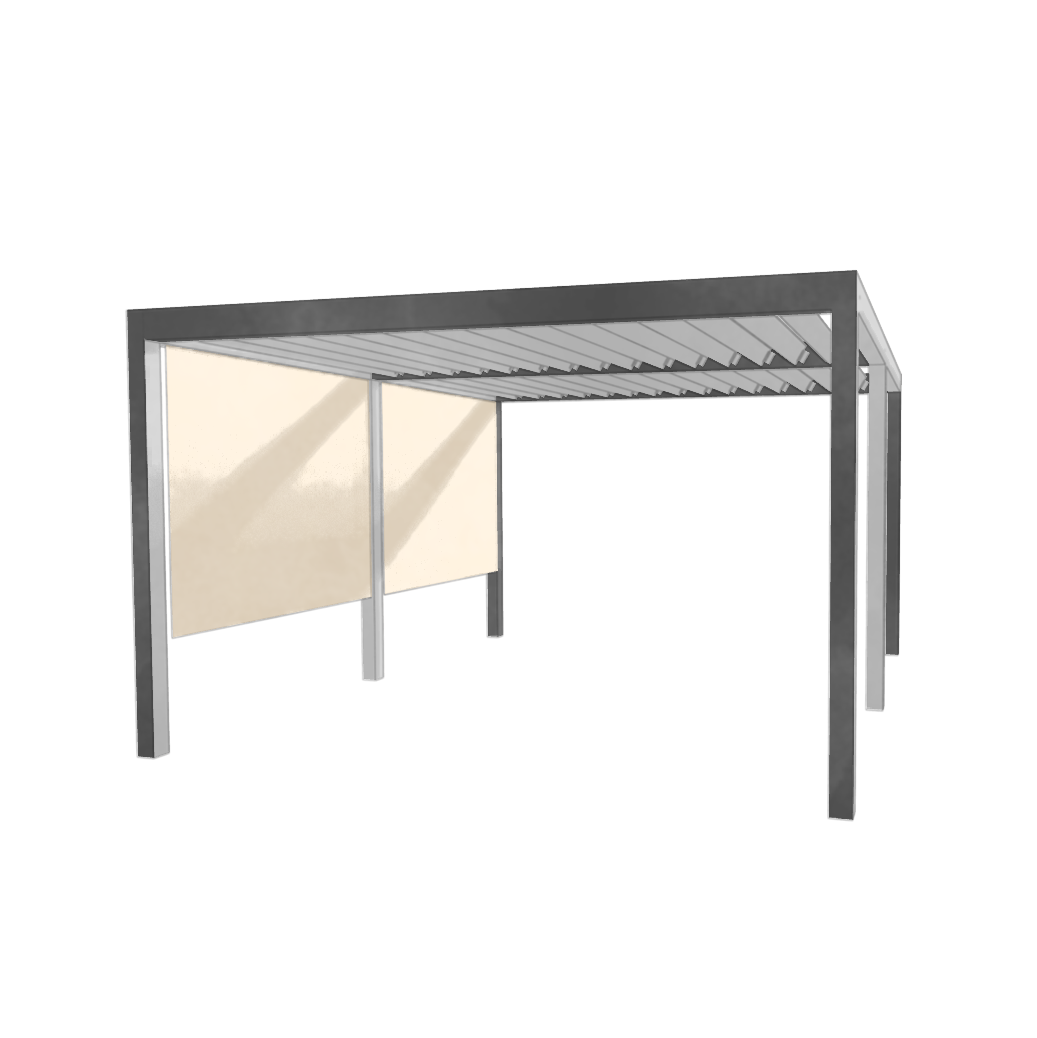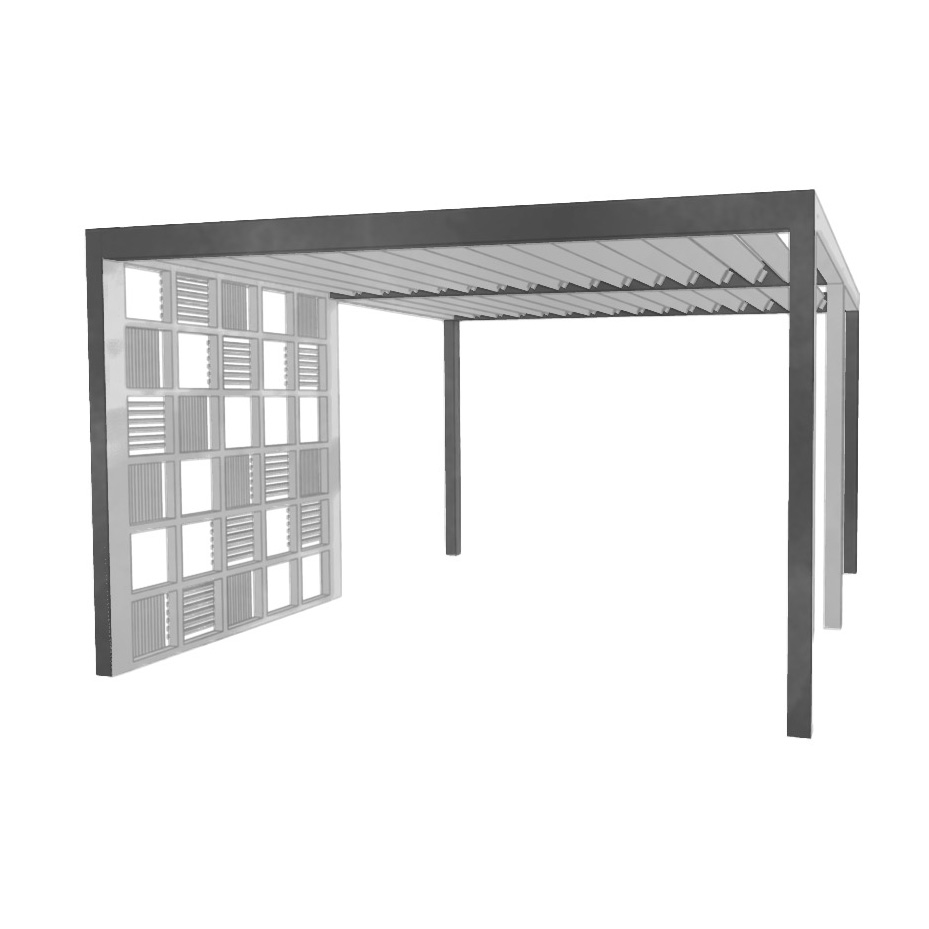 Operable louvers are available and can be adjusted manually or automatically, laying flat when closed and channeling water through integrated gutters into posts or site drains.